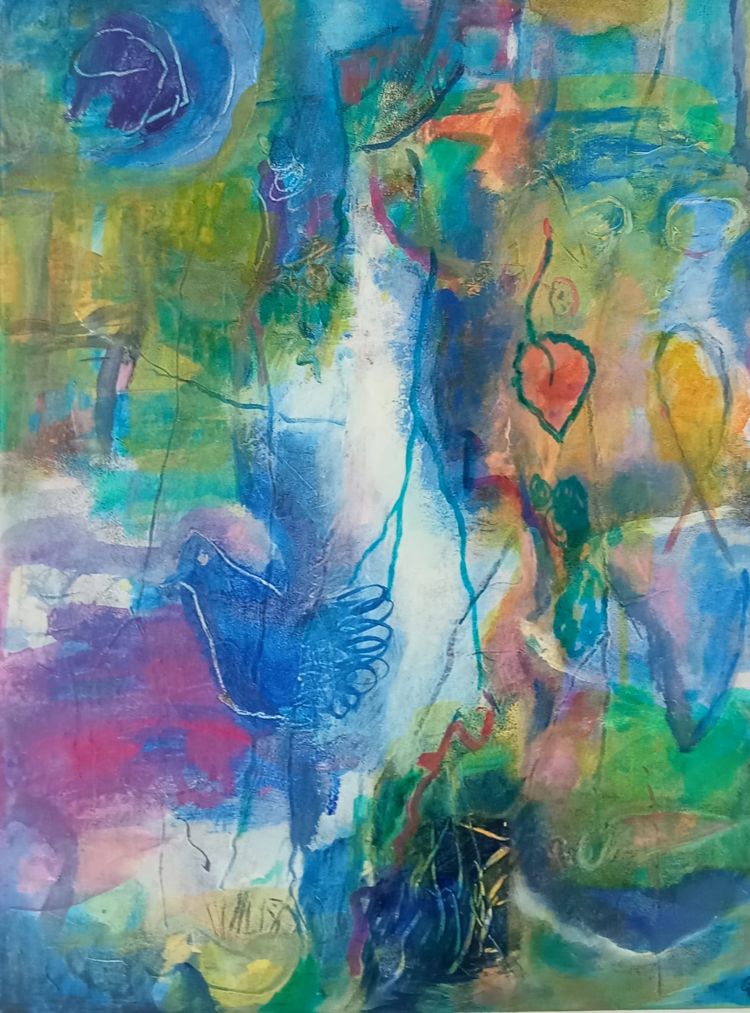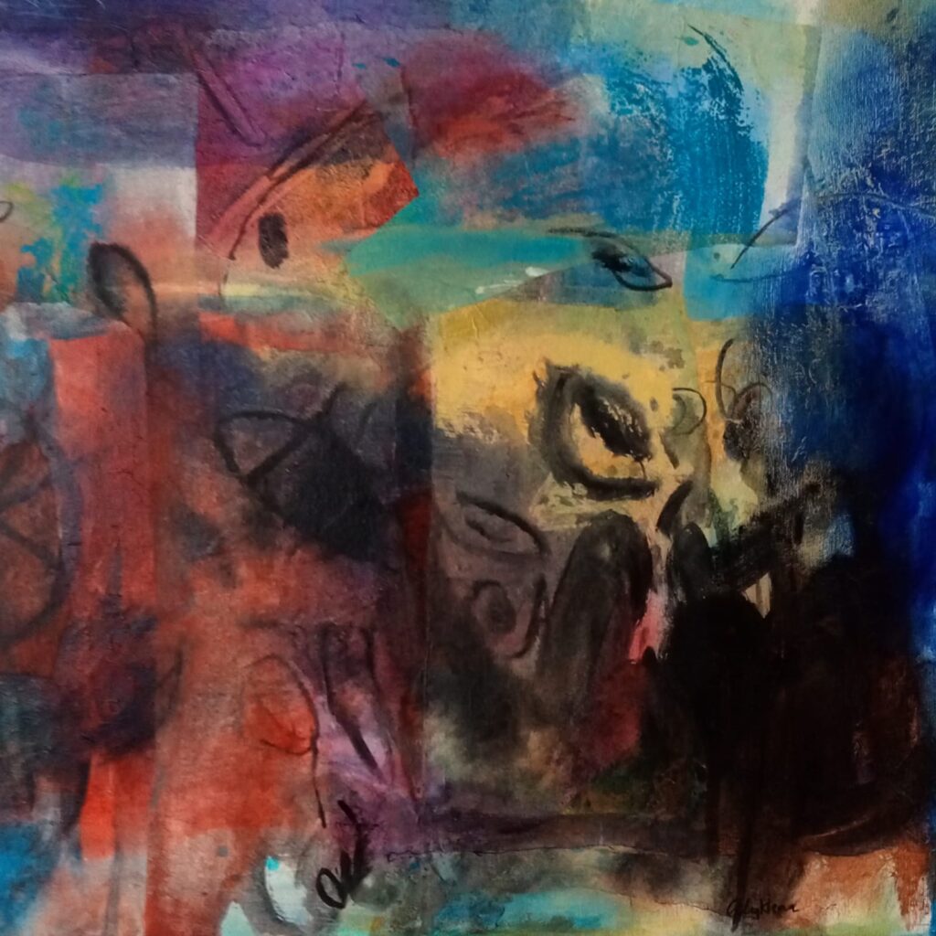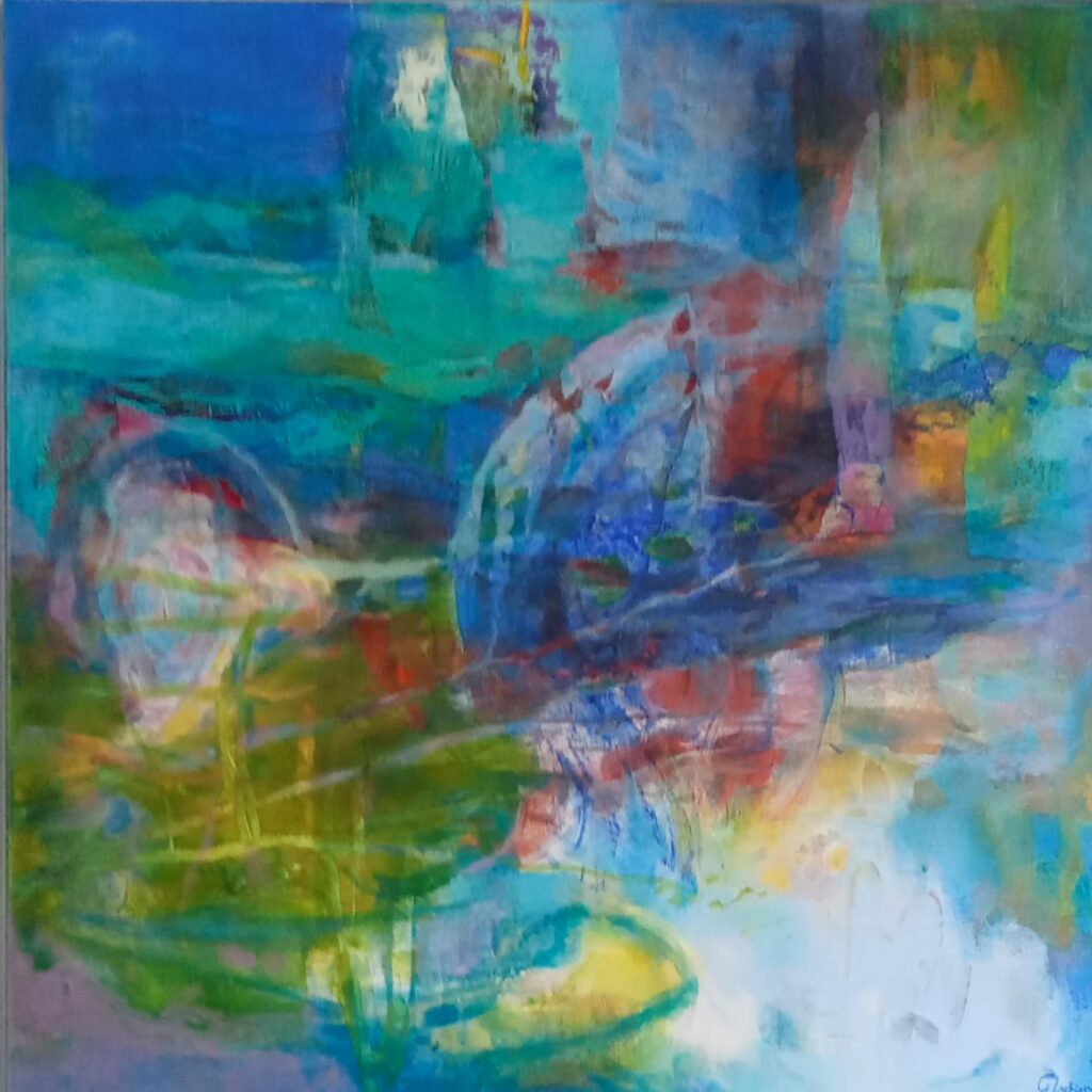 Waterwereld, 80 x 80 cm Onderstroom 1, 80 x 80 cm Wachter 2, 40 x 40 cm Onderstroom 2, 70 x 70 cm Dansen op de vulkaan, 70 x 70 cm Vuurvogel, 40 x 50 cm Blauwe vogel, 40 x 50 cm