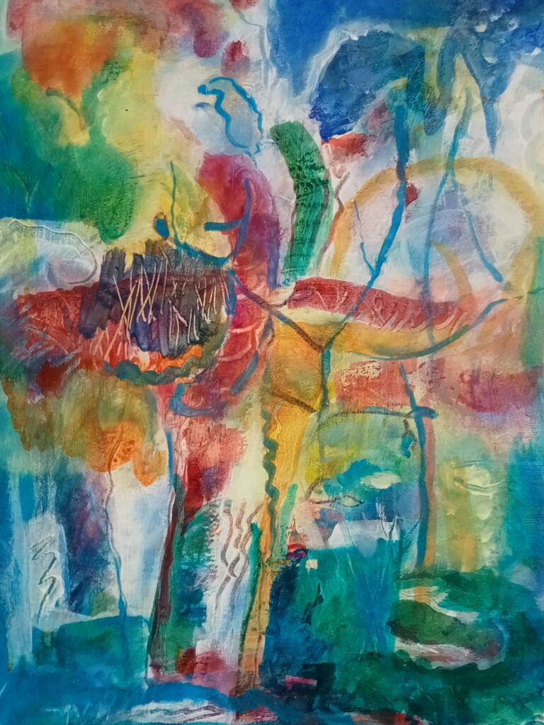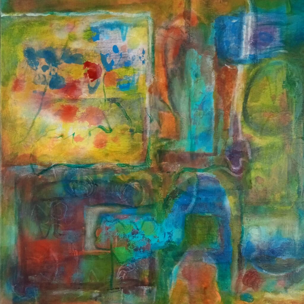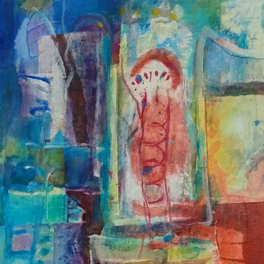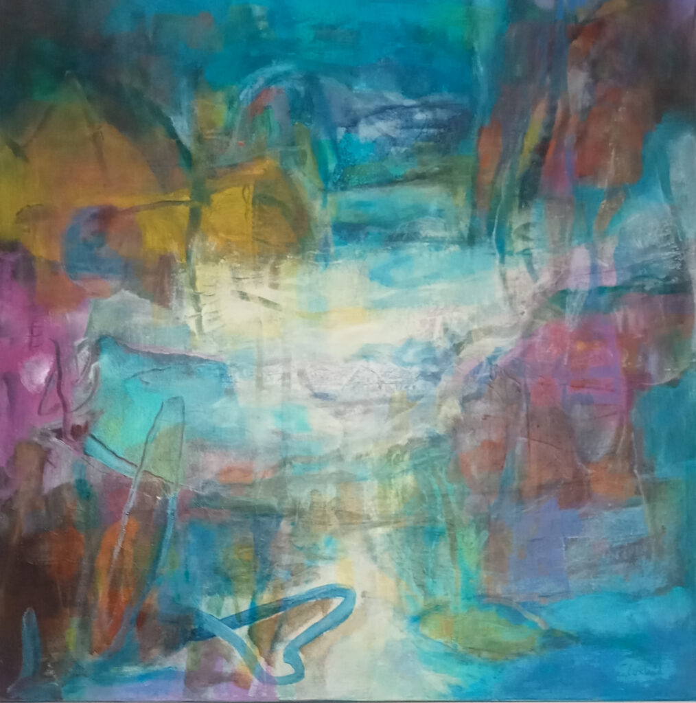 Waterwereld, 80 x 80 cm Onderstroom 1, 80 x 80 cm Wachter 2, 40 x 40 cm Onderstroom 2, 70 x 70 cm Dansen op de vulkaan, 70 x 70 cm Vuurvogel, 40 x 50 cm Blauwe vogel, 40 x 50 cm