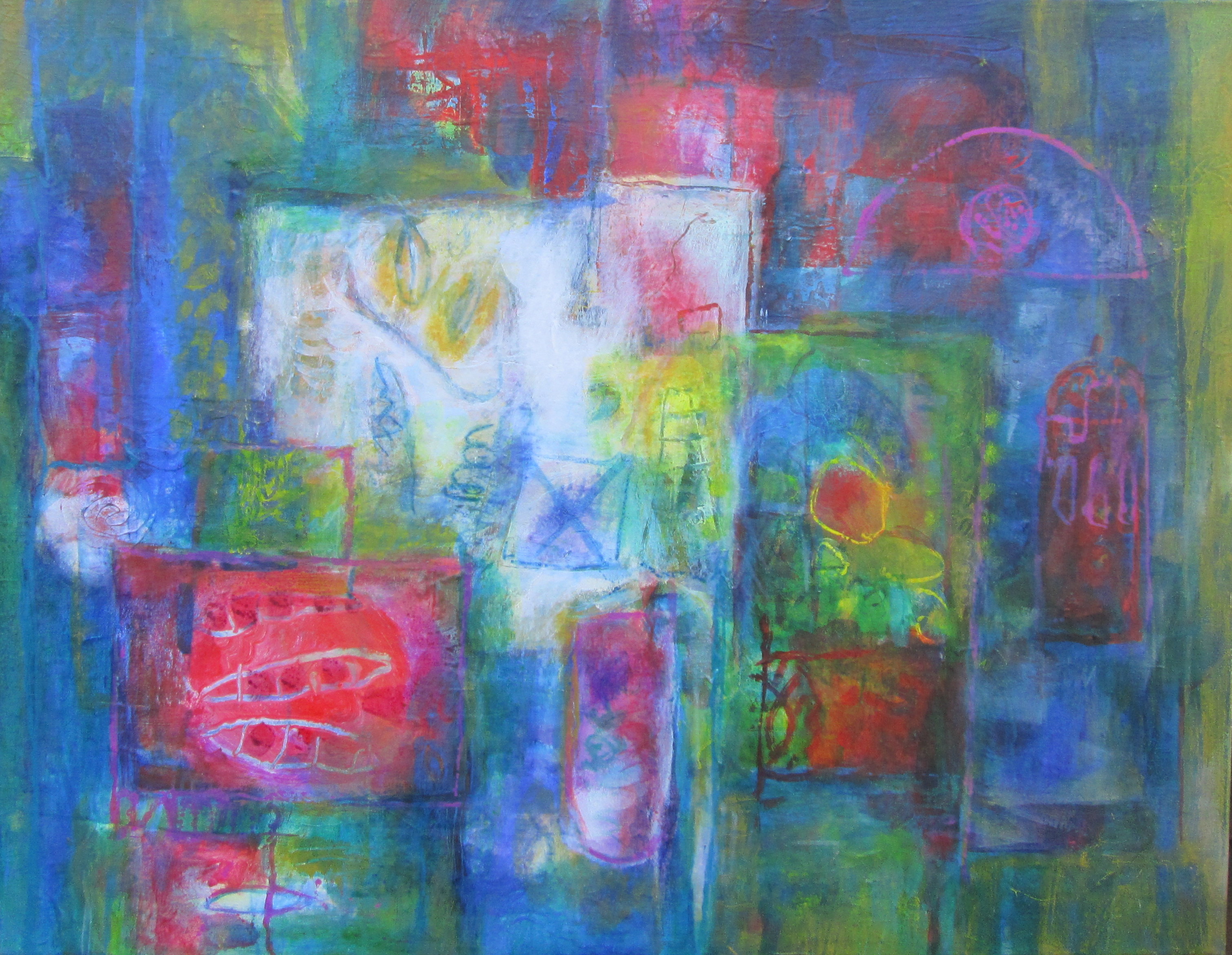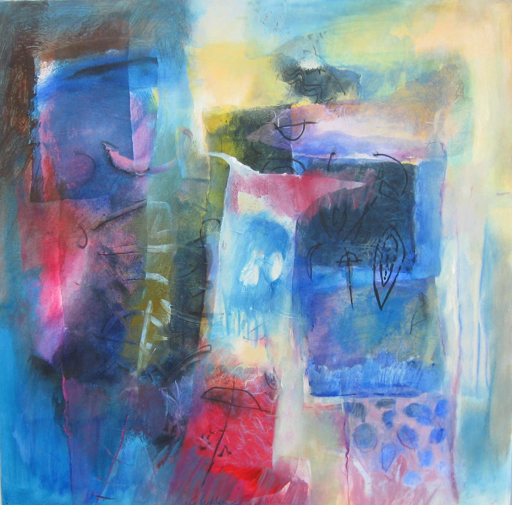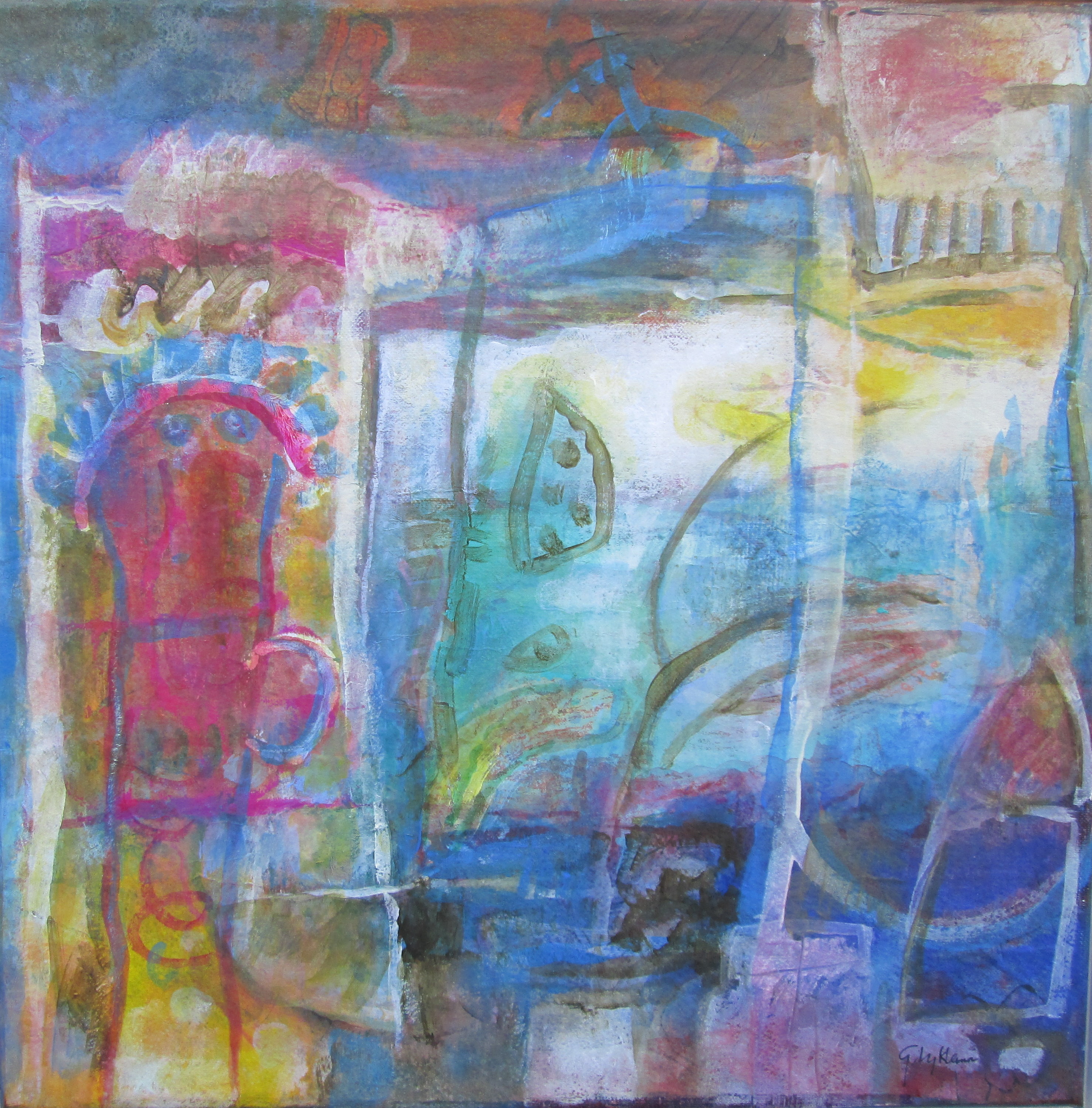 Herinnering, 70 x 90 cm Wachter Het levensrad draait 2 Les bleues 2, 80 x 80 cm Les bleues 1, 80 x 80 cm Lichtend, 80 x 80 cm